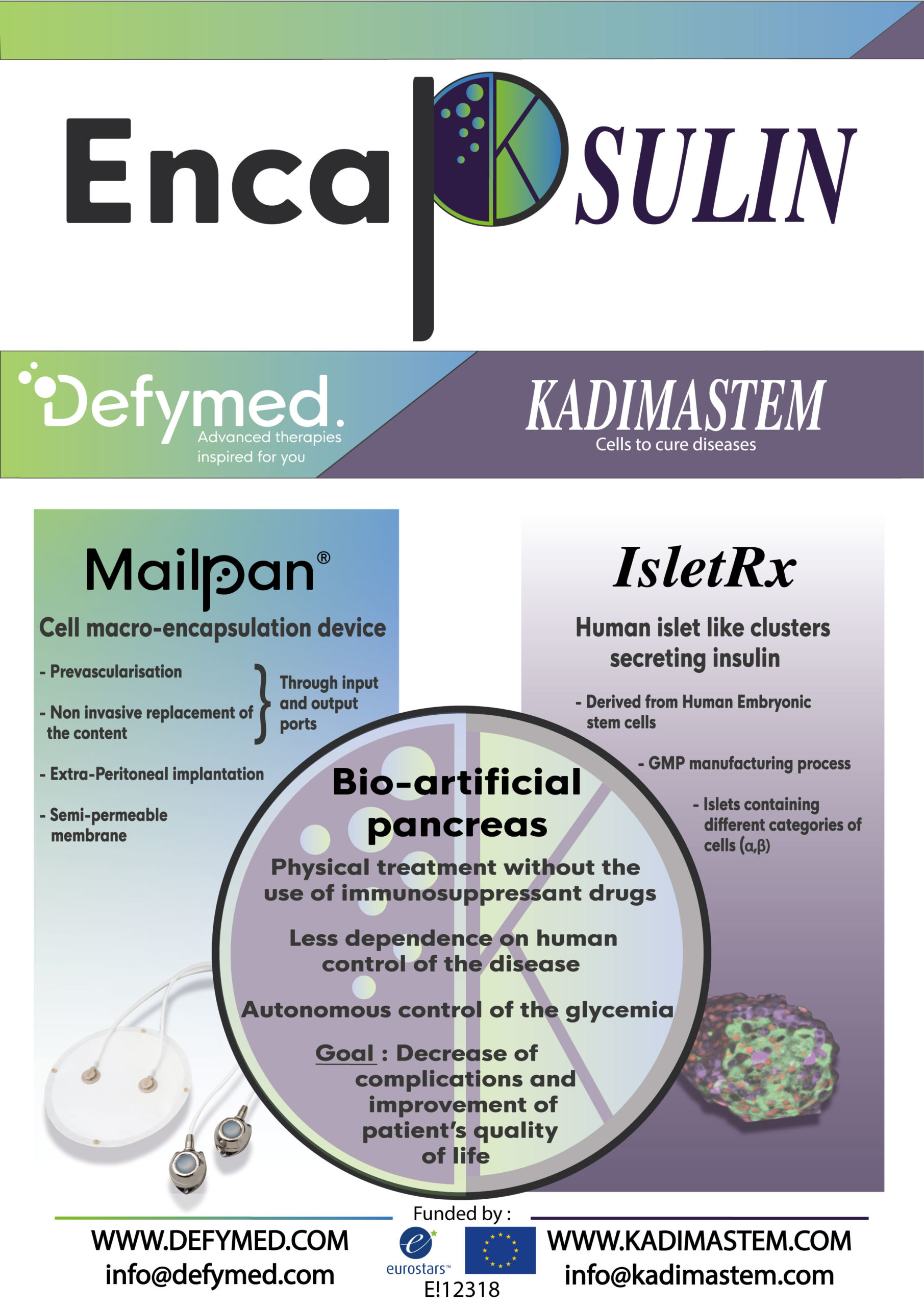 The ENCAPSULIN project, of 24-month duration, started in November 2018, intends to test the Bioartificial Pancreas MailPan® (Defymed) in combination with ILCs derived from hESC (Kadimastem) and therefore validate its features necessary for a future entry into clinical trials in Human. More specifically, this study aims to validate the function, safety and immune-protection of the combination in vitro and in vivo.